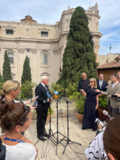 Nach einer Privataudienz bei Papst Leo XIV. im Apostolischen Palast fand eine Begegnung mit Vertretern der Presse auf der Terrasse des Campo Santo Teutonico statt.